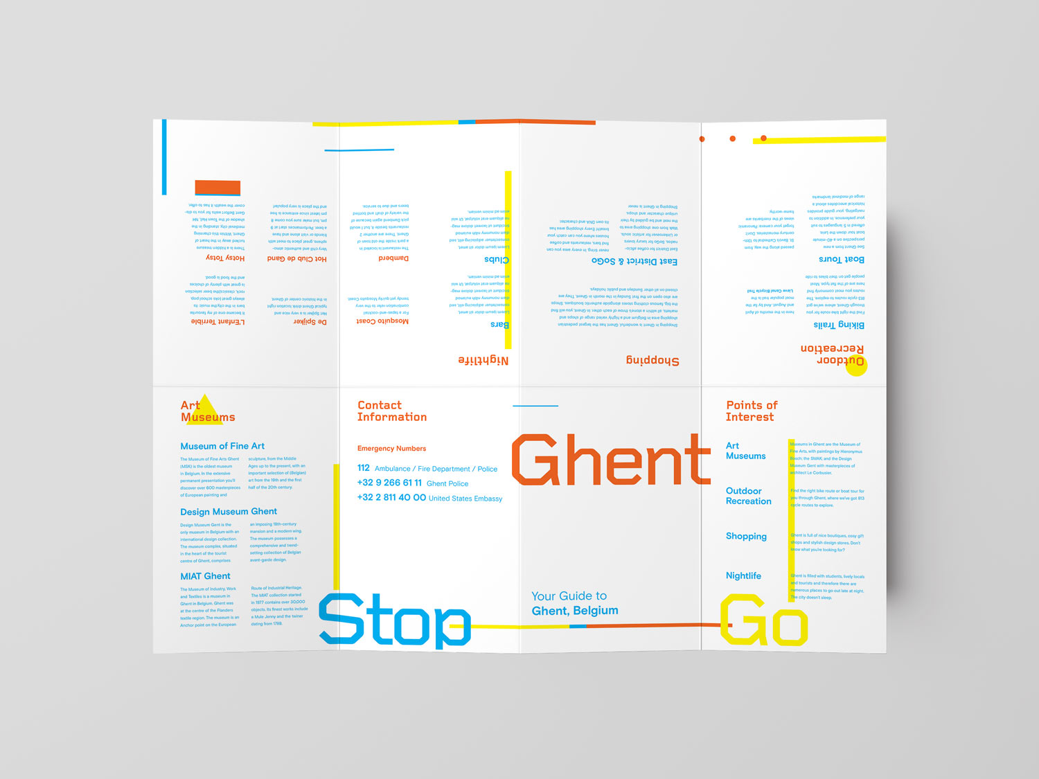 An 8-panel foldout city guide for Ghent, Belgium. Project includes a custom, stylized map.